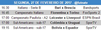 Os jogos a seguir estão em horário de Brasília e são válidos para o dia 11 de fevereiro de 2017 para os canais Globo e suas afiliadas, SPORTV e Premiere.