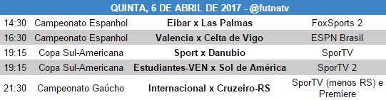 A programação está quente na quinta-feira do SporTV, com muito futebol, além de vôlei e automobilismo. E tem ainda transmissão de surfe pelo SporTV.com e SporTV Play. Entre os destaques, dois jogos da Copa Sul-Americana e o duelo entre Internacional e Cruzeiro-RS, pelas quartas de final do Campeonato Gaúcho.